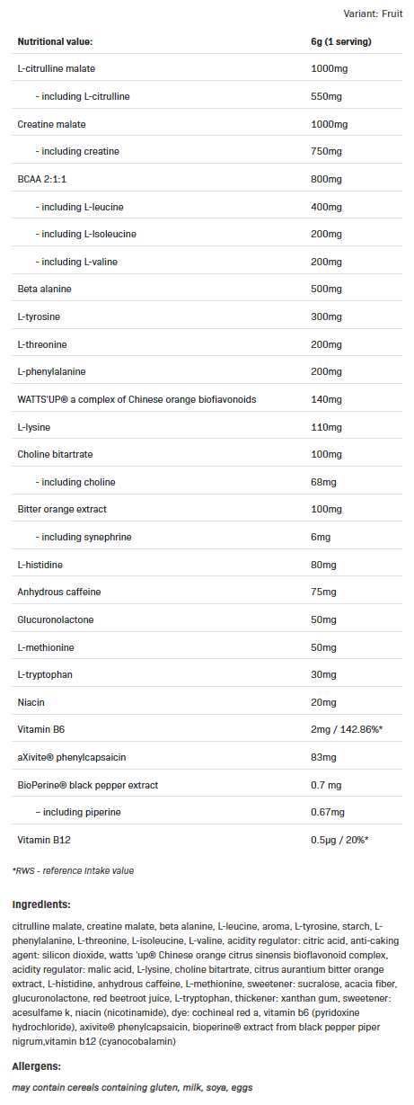 Комбинацията от вещества, поддържащи нервната система, е това, което отличава LOCO SPEED & ENERGY от другите предтренировъчни добавки. От стимулиращия ефект до подкрепата на невротрансмитерите. Комплексният подход за оптимизиране на работата на нервната система по време на тренировка е изключително важен – особено в дисциплини, изискващи скорост. Скоростта, с която електрическите импулси се предават между невроните и мускулните клетки, определя кога мускулите ще се свият. Благодарение на съставките, съдържащи се в азотния бустер LOCO SPEED & ENERGY, този процес е по-ефективен, което от своя страна води до по-кратко време за реакция. Благодарение на това вашите мускули ще могат да работят с части от секундата по-бързо, но често именно части от секундата решават победата. Защо азотен бустер LOCO ENERGY & SPEED? LOCO ENERGY & SPEED е рецепта, на която всеки спортист трябва да даде 100% от себе си по време на всяка тренировка, като същевременно поддържа психическа яснота. LOCO ENERGY & SPEED съдържа трио от съставки, които подобряват резултатите в почти всяка спортна област: креатин, L-цитрулин и бета-аланин. Подпомагането на секрецията на ATP (мускулна енергийна единица), подобряването на кръвоснабдяването на мускулите и увеличаването на мускулната издръжливост от тренировка на тренировка са ключът към отключването на пълния ви тренировъчен потенциал Енергията – не под формата на стимулация, а като гориво за работещите мускули е резултатът, който искахме да постигнем, когато създавахме този продукт. Осигуряването на ключови съставки за работата на мускулите определя дали тялото ви ще може да генерира адекватна енергия на клетъчно ниво и ще дава 100% мощност! Високото съдържание на незаменими аминокиселини в продукта подпомага мускулната функция, има антикатаболни свойства и подпомага регенерацията след тренировка, което е изключително важно за всеки спортист. Тирозин и холин са комбинация, която ефективно повлиява правилния синтез на невротрансмитери, благодарение на което информацията между мозъка и мускулите се изпраща много по-бързо. От решаващо значение е скоростта на реакцията. От друга страна, тирозинът заедно с екстракт от горчив портокал намалява чувството на умора и стимулира, което ви позволява да продължите да тренирате с максимална скорост. Интензивните физически усилия с продължителност от няколко до няколко десетки минути са част от повечето спортни дисциплини. През това време мускулите извършват усилена работа, кръвоносната система работи на пълен капацитет, а умът е принуден да полага максимални усилия. Основата за приготвянето на уникалната рецепта LOCO ENERGY & SPEED беше поддръжката на тези сложни процеси. Създадохме продукт, който подпомага набавянето на хранителни вещества чрез действието на l-citrulline и подпомага работата и регенерацията на мускулите с помощта на BCAA и EAA аминокиселини. Уникалната комбинация от тирозин, холин и витамини от група В поставя ума в състояние на необезпокоявана концентрация, така необходима по време на тренировка. WATTS’UP® е марков екстракт от китайски портокал, който дължи своята ефективност на s-хесперидин. Това лесно усвоимо съединение навлиза в кръвообращението само 15 минути след консумация, засягайки естественото производство на азотен оксид (NO) и повишавайки ефективността на митохондриите. Проучванията показват, че WA
