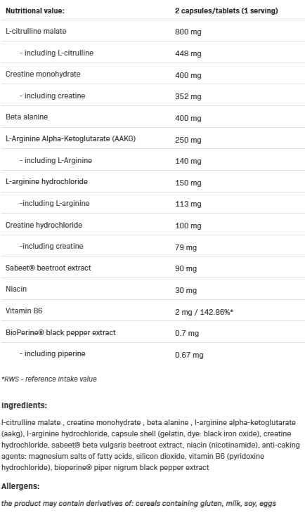 Защо LOCO POWER & PUMP? LOCO POWER & PUMP е цялостна предтренировъчна формула, чието използване по време на тренировка увеличава притока на кръв към мускулите, давайки ефект на т.нар. мускулнo напомпване. LOCO POWER & PUMP помага да се доставят хранителни вещества на тренираните мускули. Благодарение на това работата им е по-ефективна. Съдържа съставки, отговорни за увеличаване на секрецията на АТФ, което влияе на мускулната функция, осигурявайки сила по време на тренировка, но също така и вещества, които предизвикват забележимо мускулно напомпване. Известен със своята ефективност, комбинацията от L-цитрулин и две форми на L-аргинин създава усещане за разкъсваща мускулно напомпване, а добавянето на патентования екстракт от корен от цвекло Sabeet® прави тази смес изключително ефективна. Две форми на креатин , включително усъвършенствана форма на креатин хидрохлорид, значително ще повлияят на мускулната сила след първата порция, а добавянето на бета-аланин ще направи ефектите все по-добри от тренировка към тренировка. Всичко благодарение на карнозина – молекула, която се натрупва в тялото благодарение на гореспоменатия бета-аланин и подпомага мускулната работа. Добавянето на витамини B3 и B6 влияе върху функционирането на нервната система, което ви позволява ефективно да се съсредоточите върху избраната тренировка. Напредъкът е това, което определя ефектите от обучението. По-голямото тегло или по-големият брой повторения стават все по-трудни за постигане с напредването на тренировката. Ето защо създадохме LOCO POWER & PUMP – продукт, чийто усъвършенстван състав обмислено поддържа мускулната функция, дава по-голяма сила и увеличава ефекта от напомпването на мускулите с кръв. Патентовани съставки на LOCO POWER & PUMP Sabeet® е патентован от американската лаборатория Sabinsa екстракт от червено цвекло, богат на нитрати, които са естествен NO бустер. Освен нитрати, този екстракт е богат на бетаин, който активно участва в процеса на синтез на креатин и подпомага правилната хидратация на клетките. BioPerine® е екстракт от черен пипер, който повишава усвояването на витамини и хранителни вещества в храносмилателната система. Чрез повлияване на термогенезата. BioPerine® увеличава кръвоснабдяването на клетките на храносмилателния тракт, благодарение на което много съединения, съдържащи се в добавките, се използват в по-голяма степен. За да обобщим: LOCO POWER & PUMP е идеален продукт преди тренировка, насочен към чупене на силови рекорди. Страхотен е и за хора, които работят върху увеличаване на мускулната маса и оформяне на фигурата си. Начин на употреба: Приемайте една порция (2 капсули) преди тренировка с много вода. Използвайте 1-3 порции на ден. Не превишавайте 3 порции на ден (6 капсули).