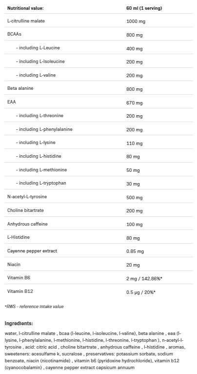 Защо LOCO ENERGY & SPEED? LOCO SHOT ENERGY & SPEED е рецептата, която всеки спортист трябва да даде на 100%, като същевременно поддържа умствена яснота LOCO SHOT ENERGY & SPEED съдържа трио от съставки, които подобряват представянето в почти всяка спортна сфера: L-цитрулин малат, BCAA и бета-аланин. Подпомагането на секрецията на ATP (мускулна енергийна единица), подобряването на мускулното кръвоснабдяване и увеличаването на мускулната издръжливост от тренировка на тренировка са ключът към отключването на пълния ви тренировъчен потенциал. Енергията – не под формата на стимулация, а като гориво за работещите мускули е резултатът, който искахме да постигнем, когато създавахме този продукт. Осигуряването на ключови съставки за мускулната работа определя дали тялото ви ще може да генерира подходяща енергия на клетъчно ниво и да ви даде 100% мощност! Високото съдържание на незаменими аминокиселини в продукта подпомага мускулната функция, има антикатаболен ефект и подпомага регенерацията след тренировка, което е изключително важно за всеки спортист. Комбинацията от съставки, поддържащи нервната система, е това, което отличава LOCO ENERGY & SPEED от другите предтренировъчни добавки. От стимулиращи ефекти до невротрансмитерна подкрепа. Комплексният подход за оптимизиране на функционирането на нервната система по време на тренировка е изключително важен – особено в дисциплини, които изискват скорост. Скоростта, с която електрическите импулси се предават между невроните и мускулните клетки, определя момента, в който настъпва мускулната контракция. Благодарение на съставките, съдържащи се в LOCO ENERGY & SPEED, този процес протича по-ефективно, което от своя страна води до по-кратко време за реакция. Благодарение на това вашите мускули ще могат да работят с части от секунди по-бързо, но често именно части от секунди решават за победата Тирозин и холин са комбинация, която ефективно влияе върху правилния синтез на невротрансмитери, благодарение на което информацията между мозъка и мускулите се предава много по-бързо. Това е от решаващо значение за скоростта на реакция. Но тирозинът заедно с екстракт от горчив портокал намалява чувството на умора и стимулира, което ви позволява да продължите да тренирате с максимална скорост. Интензивната физическа активност с продължителност от няколко до няколко десетки минути е елемент от повечето спортни дисциплини. През това време мускулите работят усилено, кръвоносната система работи на пълни обороти, а умът е принуден да полага максимални усилия. Основата за изготвянето на уникалната рецепта LOCO ENERGY & SPEED беше да поддържа тези много сложни процеси. Създадохме продукт, който чрез действието на L-цитрулин подпомага доставката на хранителни вещества, използвайки аминокиселини BCAA и EAA , подпомага функцията и регенерацията на мускулите. Уникалната комбинация от тези аминокиселини с витамини от група В поставя ума в състояние на необезпокоявана концентрация, така необходима по време на тренировка. Начин на употреба: използвайте 1 порция (60ml) преди тренировка. Разклатете преди употреба. Не превишавайте 2 порции на ден (120ml).