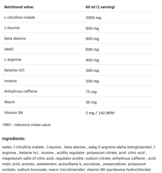 Защо LOCO SHOT POWER & PUMP? LOCO POWER & PUMP е цялостна формула, която, когато се използва по време на тренировка, увеличава притока на кръв към мускулите, като дава т.нар. мускулно напомване. LOCO SHOT POWER & PUMP помага за доставянето на хранителни вещества към тренираните мускули. Благодарение на това работата им е по-ефективна. Съдържа съставки, отговорни за увеличаване на секрецията на АТФ, което влияе на мускулната функция, осигурявайки сила по време на тренировка, но също така и вещества, които предизвикват забележимо мускулно напомпване. L-цитрулин малат, известен със своята ефективност, и L-аргинин в комбинация дават усещането за мускулно помпане. Формата на използвания креатин има значително влияние върху мускулната сила след първата порция, а добавянето на бета-аланин ще направи ефектите все по-добри от тренировка на тренировка. Всичко благодарение на карнозина – молекула, която се натрупва в тялото благодарение на гореспоменатия бета-аланин и подпомага мускулната работа. Добавянето на витамини B3 и B6 влияе върху функционирането на нервната система, което ви позволява ефективно да се съсредоточите върху избраната тренировка. Напредъкът е това, което определя ефектите от обучението. По-голямото тегло или по-големият брой повторения стават все по-трудни за постигане с напредването на тренировката. Ето защо създадохме LOCO POWER & PUMP – продукт, чийто усъвършенстван състав обмислено поддържа мускулната функция, дава по-голяма сила и увеличава ефекта от напомпването на мускулите с кръв. Начин на употреба: Приемайте 1 доза (60ml) преди тренировка. Разклатете преди употреба. Не превишавайте 2 порции на ден (120ml).