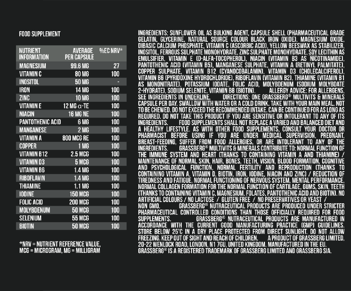Grassberg Multivits & Minerals е комплекс от витамини и минерали покриващ базовите дневни нужди от микроелементи и е особено подходящ за активни хора. Физически активните хора имат нужда от повече витамини и минерали и това може да доведе до потенциални дефицити, които биха могли да отслабят имунната система, да влошат възстановяването, тонуса и настроенито през деня. В забързаното ежедневие и за хора спазващи диета, често пъти е трудна задача да се набавят нужните витамини и минерали от разнообразна храна. Grassberg Multivits & Minerals ви дава възможност да го направите без да добавяте излишни калории към диетата си, което би могло да компрометира резултатите ви. Само 1 капсула от витамините и минералите на Grassberg покрива 100% от дневните нужди на организма и са подходящи както за спортисти, така и за хора с активен начин на живот. Grassberg Multivits & Minerals е под формата на меки капсули, които са по-лесни за преглъщане и се усвояват по-бързо. Начин на прием: Една капсула дневно с някое от основните хранения.