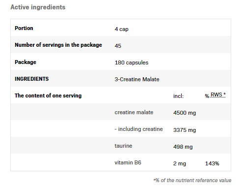 Какво е креатин малат? 3-креатин малат е най-висококачественият креатин малат с добавка на аминокиселината таурин и витамин В6. Креатин малатът е подобрена форма на креатин, характеризираща се с по-добра разтворимост и по-голяма химическа стабилност. Витамин В6 допринася за намаляване на умората и допринася за правилния метаболизъм на протеини и гликоген. 3-креатин малат – ефекти! Ефектът от използването на 3-креатин малат е да увеличи резервите на креатин в мускулите под формата на фосфокреатин, което се изразява в по-голям брой повторения на дадено упражнение по време на тренировка. В мускулните клетки креатинът навлиза в митохондриите, където се трансформира във фосфокреатин и след това е отговорен за преноса на АТФ в организма. В резултат на това ви позволява да поддържате високо ниво на интензивност на тренировка, по-специално тренировки за сила и издръжливост. Използването на ALLNUTRITION 3-Creatine Malate ускорява растежа на чистата телесна маса благодарение на анаболния си ефект, а също така намалява разграждането на мускулните тъкани (катаболизъм). Таурин – свойства! Тауринът е универсална аминокиселина и едно от основните му свойства е да подпомага възстановяването на мускулите след тренировка. Поради тази причина тауринът може да се намери в състава на 3-креатин малат. В допълнение, тауринът има антикатаболни ефекти, подобни на тези на глутамин. И двете вещества съхраняват и транспортират азот, който играе ключова роля при възстановяването на увредената тъкан след тренировка. Благодарение на него тъканите могат сами да произвеждат протеини, за да възстановят структурите си и не е необходимо да използват аминокиселини, получени от счупени мускулни протеини. Следователно процесът на катаболизъм се инхибира и регенерацията на тялото протича без загуби. Начин на употреба: В тренировъчни дни приемайте 1 доза (4 капсули) непосредствено преди тренировка. В нетренировъчни дни – 1 доза сутрин след ставане.