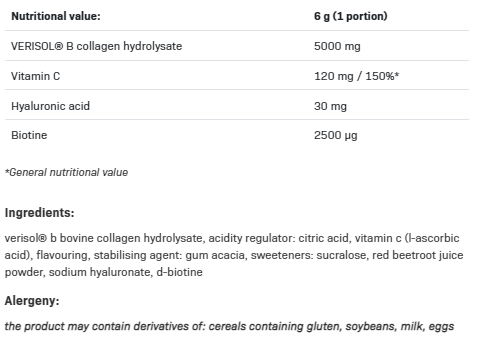 COLLAROSE е изключително изискана добавка за всички жени, които се грижат за своята красота и здравия вид на кожата, косата и ноктите си. Ако принадлежите към тази група дами, не можете да подминете продуктовата линия ALLDEYNN COLLAROSE с колагеновите пептиди VERISOL®. Въпреки че през годините за красотата се е грижила предимно чрез различни козметични продукти, научните изследвания категорично показват, че за да се погрижим за коса, която е устойчива на косопад, нокти, които не се чупят при първа възможност, както и еластична и сияйна кожа е необходимо преди всичко да се осигури наличието на определени съединения в храненето. Хранителното състояние на тялото води до състоянието на всички тъкани, както извън, така и вътре в тялото. Основният градивен протеин на тялото е колагенът, чието производство зависи именно от наличието на аминокиселини и витамин С в храната. Изследователите са забелязали, че при липса на колаген в храната, естественият синтез на това съединение също намалява. Такъв е случаят например с хора на веганска диета, тъй като колагенът се намира предимно в хрущялите на бозайниците и рибните кости. ALLDEYNN COLLAROSE е формула, която има многостранен ефект върху колагеновия баланс. Съдържа четири активни вещества, две от които действат директно и други две – индиректно. Най-важни са биоактивните колагенови пептиди, които се произвеждат от фармацевтичната компания GELITA. Колагеновите пептиди се получават чрез частично разграждане на колагена, така че те се абсорбират бързо от храносмилателния тракт и са лесно достъпни за тъкани като кожа, коса, нокти, но също и сухожилия, хрущяли, мускули, органи или кръвоносни съдове. В допълнение, COLLAROSE съдържа витамин С, който участва пряко в производството на колаген в тялото, биотин (витамин B7), който участва в производството на кожни клетки, или силно свързващата вода хиалуронова киселина. Защо тези добавки са толкова важни? Витамин Ц Само с достатъчни количества витамин С тялото е в състояние да произвежда колаген ефикасно и ефективно. Освен това витамин С оказва силно влияние върху окончателната форма, правилната и здрава структура на колагеновите влакна и има силно антиоксидантно действие. Биотин Биотинът е известен още като витамин H или витамин B7. Наричат ​​го още ВИТАМИН НА МЛАДОСТТА. Осигурява ни повече енергия, регулира настроението ни и подобрява усвояването на витамин С. Той е уникален витамин от група В, който влияе положително върху качеството на нашето здраве и живот. Въпреки че биотинът има много различни функции, без съмнение най-популярната му роля е да влияе върху състоянието на косата, кожата и ноктите. Хиалуронова киселина Хиалуроновата киселина е органично съединение, което присъства във всеки жив организъм. Има хигроскопични свойства, т.е. свойства, които му позволяват да свързва водата в дермата. Една молекула хиалуронова киселина е в състояние да свърже до 250 водни молекули. С напредване на възрастта количеството на хиалуроновата киселина започва да намалява, така че тя губи способността си да свързва вода и се наблюдават първите бръчки. Наличието на VERISOL® пептиди в COLLAROSE влияе върху външните тъкани на тялото и по този начин върху цялостния външен вид на тялото, както е показано в научни експерименти. AllNutrition AllDeynn Collarose Пробно проучване с продължителност 1 – 6 месеца с дози от 2,5 