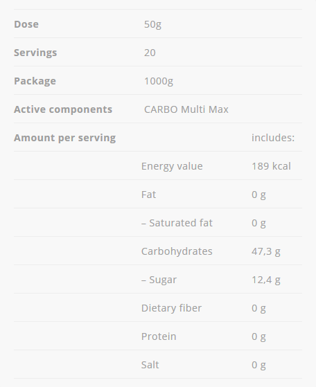 Allnutrition Carbo Multi Max е комплекс от въглехидрати. Той ще ви снабди с постоянна енергия за дълъг период от време, тъй като съдържа въглехидрати с различна бързина на усвояване. Най-бързо усвоимият въглехидрат в състава му е декстрозата, която се усвоява много бързо от организма. Хидролизираната царевична скорбяла пък от своя страна се усвоява постепенно за дълъг период от време. Allnutrition Carbo Multi Max е подходящ за прием преди тренировка тъй като повишава издръжливостта при тежки и продължителни физически натоварвания. Изключително подходящ е за аеробни спортове като футбол, тенис, плуване, волейбол и др. Много подходящ е за бодибилдери стремящи се към покачване на мускулна маса – в този случай въглехидратната матрица е добре да се консумира преди и след тренировка или като междинно хранене за набавяне на допълнителни калории нужни за мускулния растеж. Начин на прием: Разтворете 50гр в 250-300мл вода или мляко. Консумирайте 1-2 дози дневно в зависимост от вашите нужди – преди, след тренировка или сутрин.