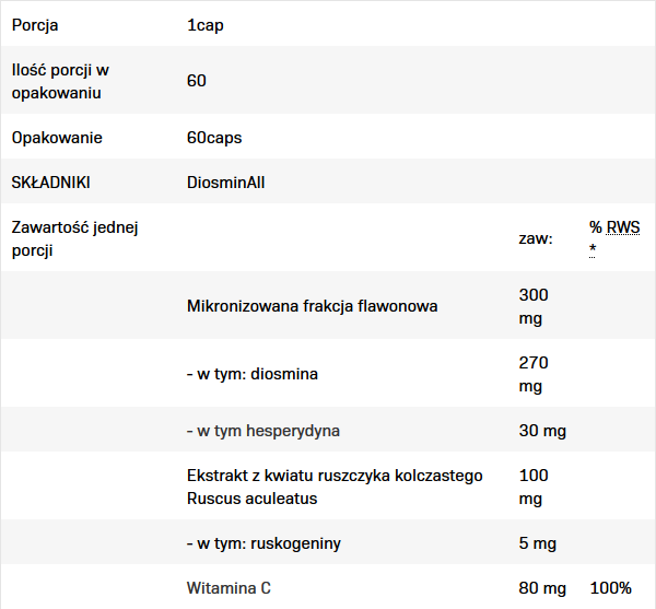 Allnutrition Diosminall е здравословна добавка съдържаща растителни екстракти и витамин C. Основната съставка е диосминът, който е флавоноид. Флавоноидите в растенията са отговорни за борбата с насекомите и гъбичките, които атакуват растението и го предпазват от излишната ултравиолетова радиация. В храносмилателната система диосминът се трансформира до диосметин под въздействието на бактериалната флора, а диосметинът се метаболизира до фенолни киселини и се екскретира с урината. Диосминът комбиниран с хесперидин и витамин C се препоръчва за допълване на диетата за поддържане на здрава кръвоносна система. Хесперидинът е органично съединение, което е вид флавоноид по-рано известен като витамин P2. Той проявява силен антиоксидантен ефект и подпомага синтеза на колаген и поддържа колагеновите структури. Благодарение на това той не само засилва непропускливостта на кръвоносните съдове, но и значително подобрява състоянието и здравината на кожата. Начин на прием: 1 капсула на ден с чаша вода.