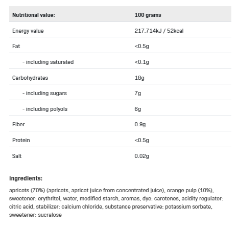 ALLNUTRITION FRULOVE IN JELLY са вкусни кайсии и портокали под формата на желе. FRULOVE е толкова деликатен с желеподобна консистенция. FRULOVE IN JELLY APRICOT & ORANGE е перфектна комбинация от два вкусни плода. Сладките кайсии и изключително сочните портокали са чудесна порция плод с много витамини! Трябва да го опитате… само внимавайте – ще се влюбите от първата чаена лъжичка! ♥ FRULOVE IN JELLY е перфектен като добавка към каша, палачинки или дори оризови сладки. И не само! Можете да го използвате и за торти, кнедли и много други десерти! Това е идеалното решение за всеки, който обича плодове! Сега можете да се наслаждавате на пресни, сочни плодове през цялата година! Разбира се, не сме добавили нито грам захар във FRULOVE! Нашият конфитюр е подсладена с еритритол и е направена от най-висококачествени съставки! Което означава, че можете да го ядете без угризения! 🙂 Свойства на кайсиите: