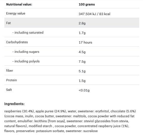 В Choco In Jelly Raspberry използвахме еритритол – най-често избираният от нашите клиенти заместител на бялата захар. Еритритолът прави нашия крем да запази всички вкусови качества и добавя невероятна сладост, като същевременно намалява калоричното съдържание на продукта.