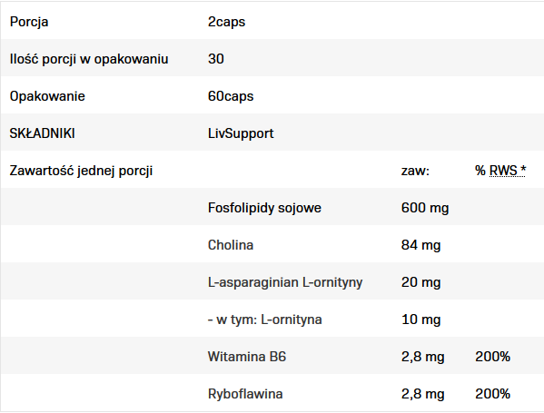 Allnutrition Livsupport е здравословна добавка съдържаща соеви фосфолипиди, холин, L-орнитин, L-аспаргинат, витамин B6 и рибофлавин. Добре подбраната формула на продукта съдейства за здравето на най-големия и важен орган в тялото – черният дроб. Всички съставки в продукта са предназначени за прочистване на черния дроб и подпомагат метаболизма на протеини, въглехидрати и мазнини. Соевите фосфолипиди са естери на холинофосфорната киселина и ненаситените мастни киселини – линолова, линоленова и олеинова. Те подобряват състоянието на клетъчната мембрана и работата на мембранните рецептори. Холинът допринася за поддържане на нормалния метаболизъм на хомоцистеин и помага за правилното функциониране на черния дроб, както и за поддържане на нормалния метаболизъм на мазнините. Рибофлавинът (витамин B2) допринася за поддържането на здрави червени кръвни клетки и за нормалното протичане на множество метаболитни процеси. Има антиоксидантни свойства и играе важна роля в защитата на клетките от оксидативен стрес. Витамин B6 поддържа правилното функциониране на нервната и имунната системи. Съдейства за поддържане на енергийния метаболизъм и регулирането на хормоналната активност. Начин на прием: Приемайте 2 капсули дневно с чаша вода.