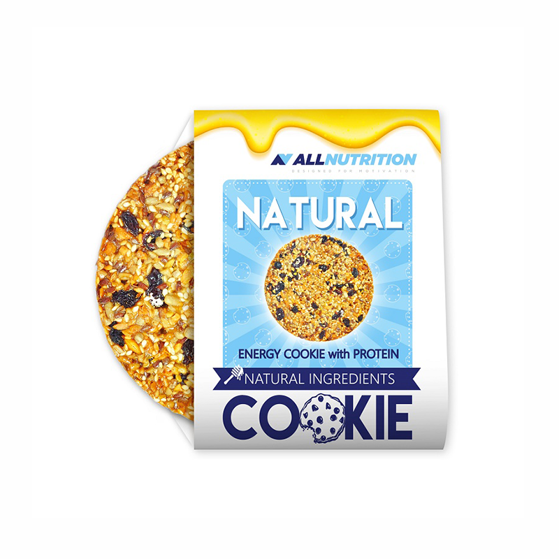 Allnutrition Natural Cookie е неустоима комбинация от сушени плодове, тиквени семки, слънчогледови семки, ленено семе, мед и протеин. Не съдържа глутен. Перфектна е за бърза закуска, преди и след тренировка или междинно хранене в моменти, когато сме на крак и искаме нещо бързо и вкусно.