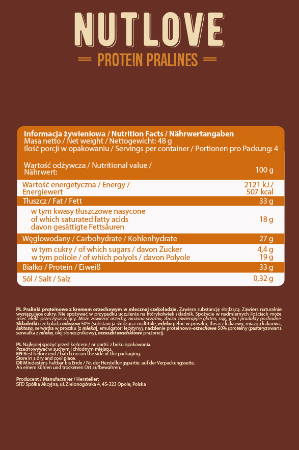 Allnutrition Nutlove протеинови пралини с млечно шоколадово фъстъчен крем са протеинови пралини с пълнеж от ядки в млечно покритие. Звучи познато? Разбира се! Вкусът на нашите пралини е вдъхновен от прекрасната линия Allnutrition Nutlove!