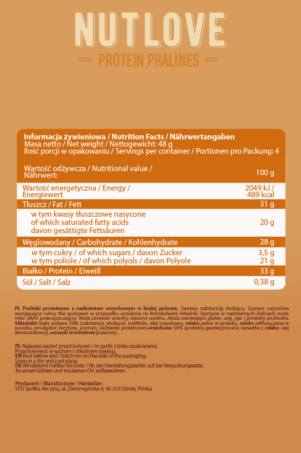 Allnutrition Nutlove Protein Pralines White Choco Peanut са протеинови пралини с пълнеж от ядки в млечно покритие. Звучи познато? Разбира се! Вкусът на нашите пралини е вдъхновен от прекрасната линия Allnutrition Nutlove!