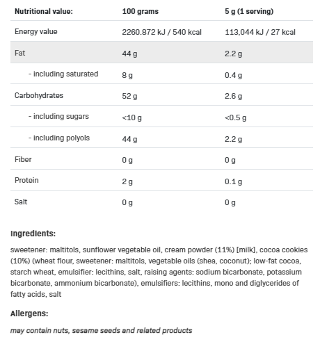 ALLNUTRITION SAUCE CRISPY COOKIE е млечно-сметанов сос с добавка на вкусни какаови бисквити. Това е още един вкус от невероятно вкусни сосове, вдъхновени от нашите най-продавани кремове NUTLOVE . Новият сос на марката ALLNUTRITION се характеризира с млечен вкус, който го прави уникален, а в комбинация с парченца бисквитки и супер кремообразна консистенция, която се разнася идеално по повърхността на всяко ястие го прави уникален! Сосът не съдържа никакви добавки като трансмазнини или палмово масло. Подсладен е с малтитол, без добавена захар, чието много ниско съдържание се дължи на естествения му произход.