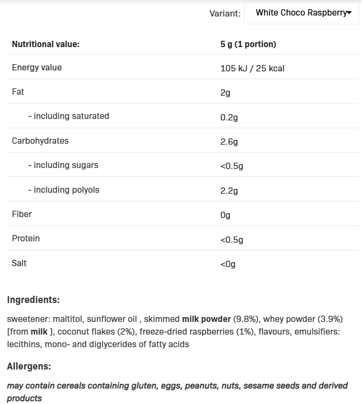 Allnutrition NutLove Sauce – White Choco Raspberry е изкусителен и диетичен сос, който съчетава нежния вкус на бяла шоколада с освежаващата малиновата нотка. Без добавени захари и с нулево съдържание на калории и мазнини, този сос е перфектен за овкусяване на палачинки, десерти, йогурти и напитки, без да нарушава диетата ви. Създаден с внимание към качеството, той не съдържа изкуствени оцветители, което го прави здравословен избор за всеки, който търси вкус без компромиси.