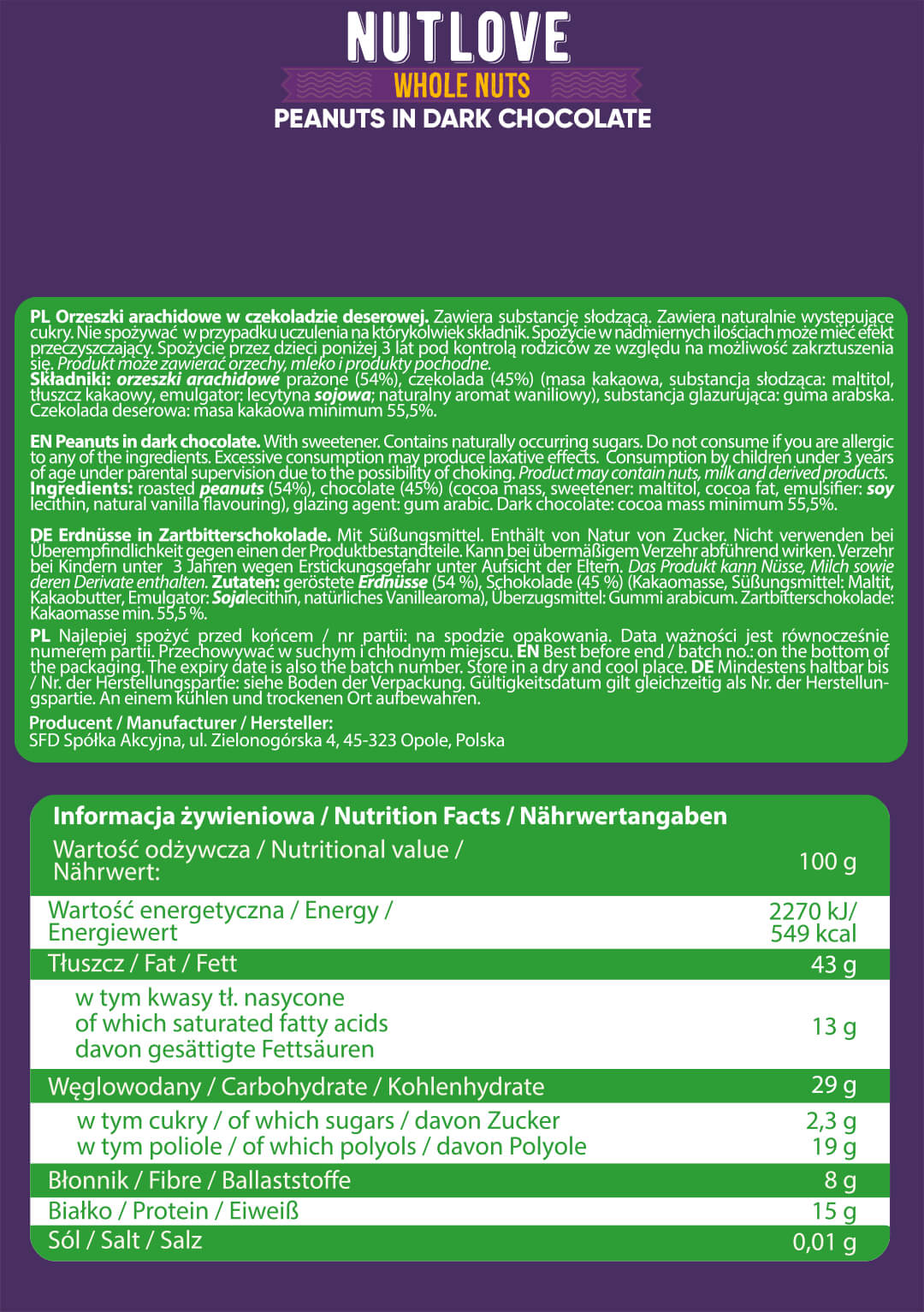 Allnutrition NutLove Whole Nuts – Peanuts са хрупкави фъстъци в тъмен шоколад. Ако обичате фъстъци и тъмен шоколад, това е идеалната комбинация за вас. Хрупкавите фъстъци, покрити с шоколад, със сигурност ще ви заредят с енергия за целия ден!