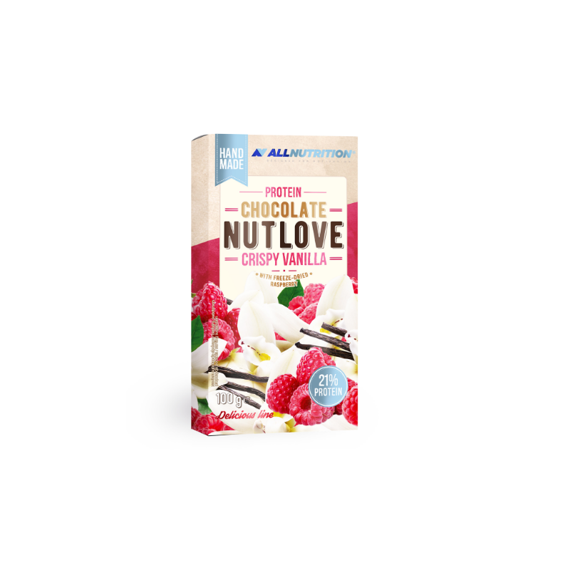 ALLNUTRITION PROTEIN CHOCOLATE NUTLOVE CRISPY VANILLA е вкусен бял шоколад с вкус на ванилия с добавка на замразени малини! Името звучи познато? Разбира се! Вкусът на най-новия ни шоколад е вдъхновен от прекрасната серия кремове ALLNUTRITION NUTLOVE.