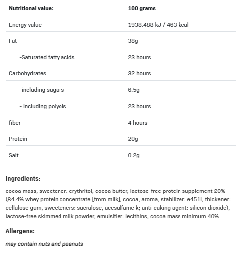 Шоколадът PROTEIN CHOCOLATE LACTOSE FREE е истинска протеинова бомба с уникален вкус, но преди всичко – продукт от най-високо качество! Нашият шоколад е направен от обезмаслено мляко на прах, което означава, че съдържа по-малко ненужни калории и има наистина невероятен вкус! Ако сте се влюбили във вкуса на нашата протеинова добавка ALLNUTRITION WHEY LACTOSE FREE CHOCOLATE, гарантираме, че ще се влюбите отново!