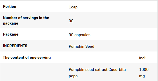 Allnutrition Pumkin Seed съдържа екстракт от тиквени семки (cucurbita pepo), който подпомага по-специално здравето на долните пикочни пътища и е изключително богатст на витамини (A, C, E, D, K, витамини от дебел В) и минерали (селен, цинк, калций, желязо, фосфор). В допълнение, той е ефективно средство, което регулира хормоналните и метаболитните промени, което е от полза, например, в случай на диабет. Начин на употреба: Приемайте 1 капсула дневно.