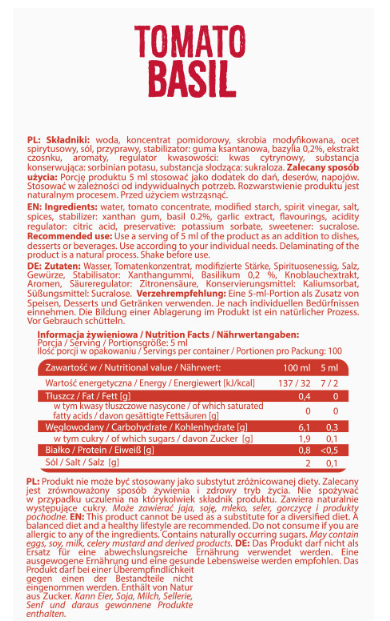 Allnutrition Sauce Tomato Basil е вкусен, ароматен и нискокалоричен сос. Без захар и без мазнини. Той е идеалното допълнение към вашите диетични ястия. Доказана рецепта от най-висококачествени съставки гарантира необикновено вкусово усещане. Перфектен е като разнообразие към ежедневна храна или барбекю. За миг подобрете вкуса на ястието си с незначително количество калории. Спазвате диета, отслабвате или се грижите за фигурата си и искате да разнообразите монотонния хранителен режим? Посегнете към класическия сос и ще бъдете положително изненадани от неговия интензивен вкус и невероятна текстура! 100% вкус, 0 мазнини, 0 захар и 0 последствия!
