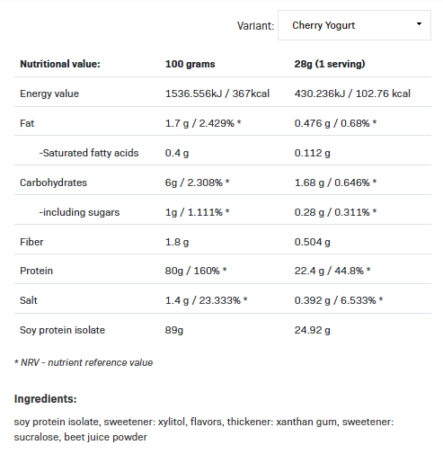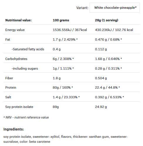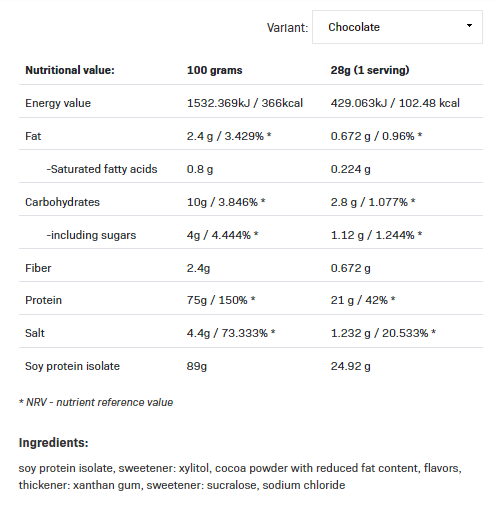 SOY PROTEIN е веган протеинова добавка в три невероятни вкуса, базирана на соев протеин изолат, който съдържа цели 89% във всяка доза. Благодарение на това добавката е благоприятна за вегани и вегетарианци. Вече не е нужно да се отказвате от мечтаната фигура само защото не можете да намерите протеинова добавка за себе си. ALLNUTRITION SOY PROTEIN е формула, предназначена не само за физически активни хора, съдържаща 89% соев протеин изолат във всяка доза. Не забравяйте, че протеинът допринася за растежа на мускулната маса и помага за поддържането й. SOY PROTEIN е високопротеинова добавка на базата на соев протеинов изолат. Соевият изолат е ценен източник на пълноценен протеин, характеризиращ се с ниско съдържание на въглехидрати и мазнини. Препаратът се препоръчва като допълнение към ежедневната диета на физически активни хора и спортисти. Соята е културно растение от групата на т.нар бобови растения. Хранителните продукти, произведени от соя, са особено лесно включени в диетата от вегетарианците като алтернатива на месото. Соевите зърна съдържат много протеини в сравнение с други растения – до 30-50% – и имат много подходящ аминокиселинен състав за хората. Соевият протеин съдържа пълна аминограма и всички незаменими аминокиселини във висока концентрация и в същото време се характеризира с много висока бионаличност. SOY PROTEIN съдържа соев протеин изолат, който като по-чиста и по-ценна форма на протеин от концентрата е лишен от ненужни въглехидрати и мазнини, поддържайки почти 85% чист протеин. Начин на употреба: За да приготвите протеинов шейк, разтворете една доза (28 g) в 300-350 ml вода. За да получите консистенцията на десерта, разтворете една порция (28 g) в 250 ml вода. Приемайте преди и / или след тренировка.
