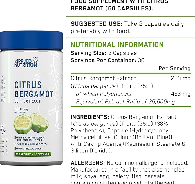 Applied Nutrition Citrus Bergamot представлява концентриран екстракт от плода на бергамот (Citrus bergamia), стандартизиран така, че да съдържа около 38 % полифеноли, включително биологично активни съединения като нарингин и неохесперидин.