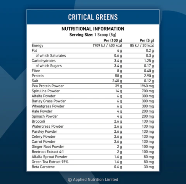 Critical Greens на прах е пълен със 17 супер зелени екстракта, включително броколи, целина, спанак, житна трева и зеле на прах, което го прави невероятно мощна, богата на хранителни вещества напитка, която допълва здравословна диета и упражнения.
