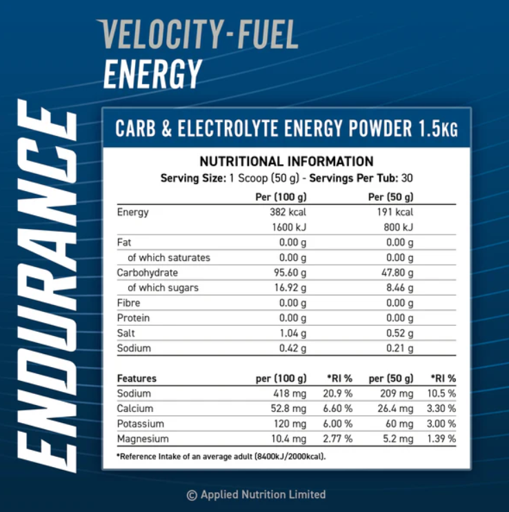 Endurance Velocity-Fuel Energy е проектиран като лесно смилаем и бърз източник на енергия, доставящ 48g бързо усвоими въглехидрати и 300mg електролити на порция с добавка на уникалната формула Breathe Easy™ на Applied Nutrition, популярна сред потребителите, които искат да увеличат приема на кислород по време на упражнение.