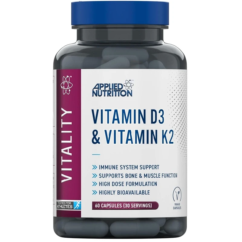 Applied Nutrition Vitamin D3 & Vitamin K2 представлява комбинирана добавка, която доставя ефективна доза витамин D3 и витамин K2 (menaquinone-7), с цел да подкрепи здравето на костите, зъбите и мускулите, и да подпомогне имунната система.