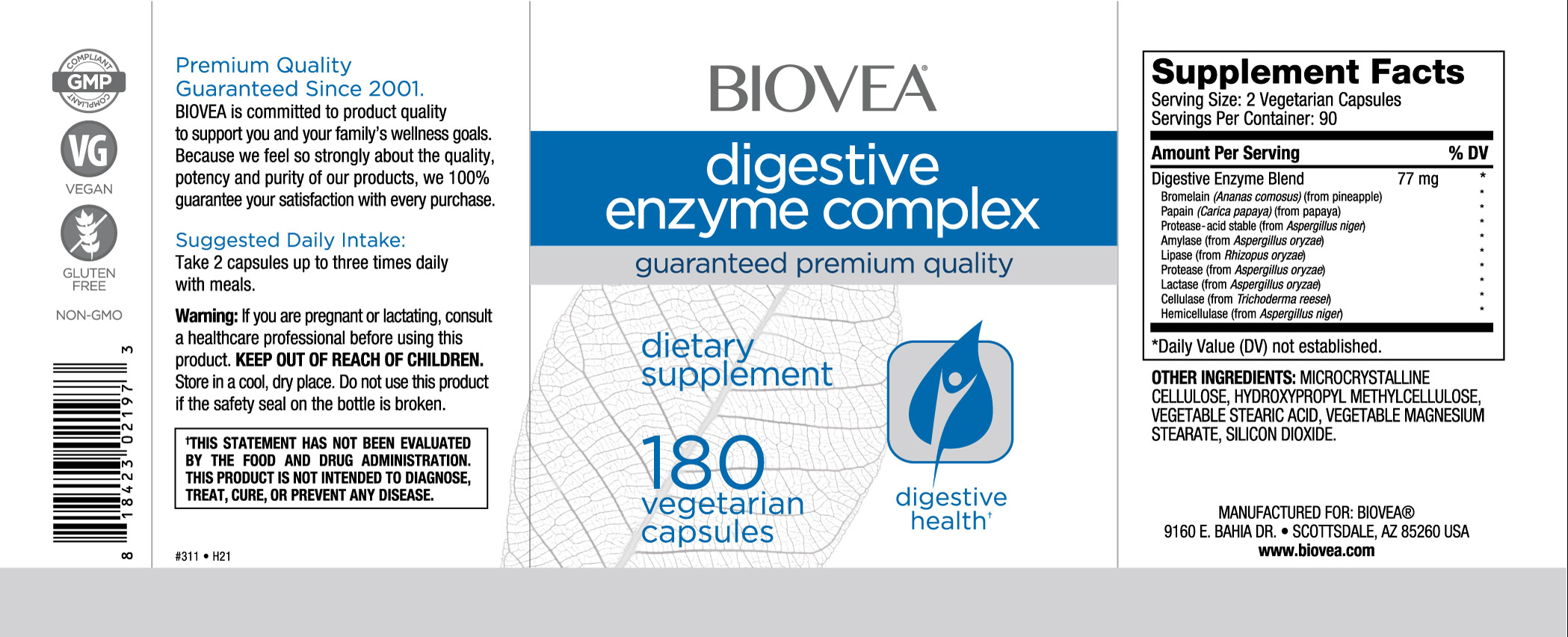 Digestive Enzyme Complex е смес от храносмилателни ензими от вегетариански произход. Продуктите, класифицирани като храносмилателни ензими, спомагат за улесняване на храносмилането, усвояването на хранителните вещества, подпомагат поддържането на правилното pH в стомашно-чревния тракт и действат като бариера срещу инвазията на вируси и бактерии. Има седем основни типа храносмилателни ензими, всеки с различни подкласификации и различни функции. Основните ензими и техните специфични функции са, както следва: амилазата усвоява нишестета, целулозата усвоява фибрите, лактазата усвоява млечните продукти, липазата усвоява мазнините, маслата и триглицеридите, малтазата смила нишестето и зърнените храни, протеазата усвоява протеините и захарозата усвоява захарите.