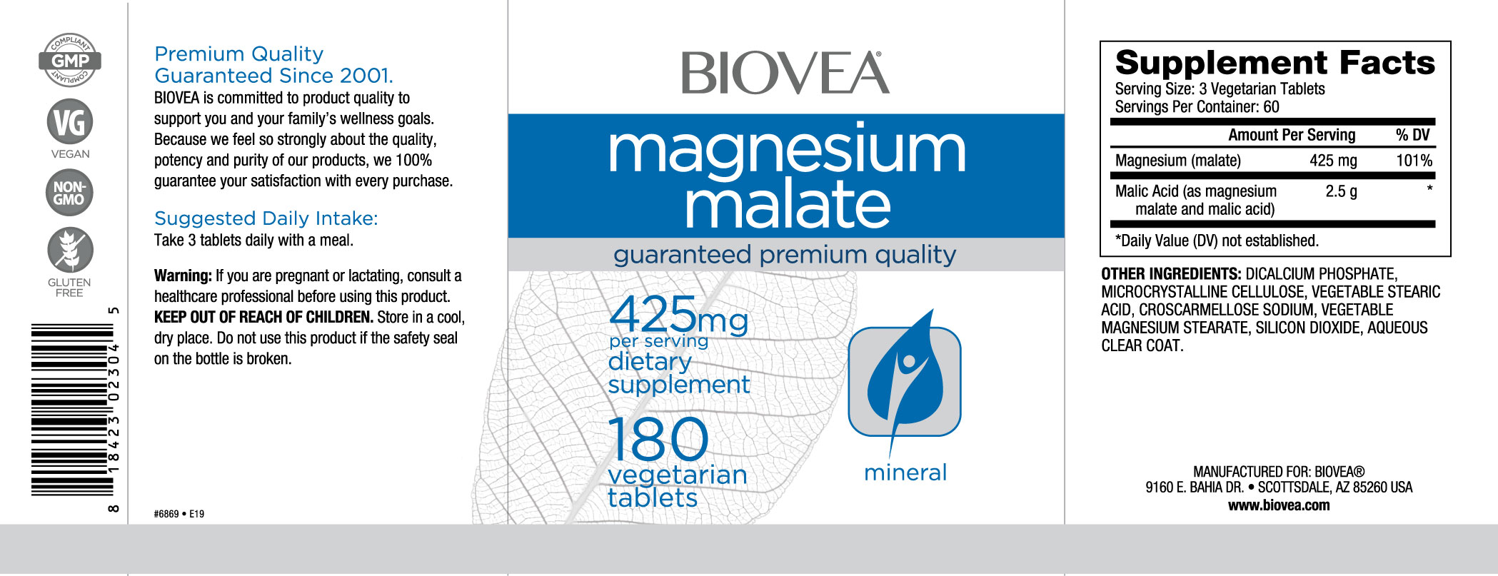 Biovea Magnesium Malate 425mg – Магнезий, Разфасовка 180 tabs