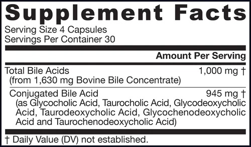 Bile Acid Factors® се състои от смес от силно концентрирани жлъчни киселини, предимно в конюгирана форма (наричани още жлъчни соли), от жлъчка от говеда в САЩ и/или Нова Зеландия. • Жлъчните компоненти в Bile Acid Factors® са важни за смилането и усвояването на мазнините. • Неадекватните жлъчни соли могат да доведат до разхлабване на изпражненията и намалено усвояване на мазнини и мастноразтворими хранителни вещества. В тънките черва жлъчните соли са необходими за емулгиране на мазнините за смилане и усвояване. Начин на употреба: Приемайте от 1 до 4 капсули с храна, съдържаща мазнини или според указанията на вашия квалифициран медицински специалист.