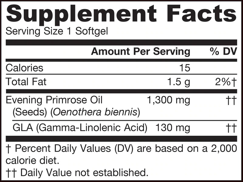 Вечерната иглика е студено пресовано масло без разтворители от семена на вечерна иглика (Oenothera biennis), превъзходен източник на гама-линоленова киселина (GLA). GLA е важна омега-6 мастна киселина, подпомагаща производството на простагландини (хормоноподобни съединения), които играят важна роля за здравето на кожата и имунната функция. Маслото от вечерна иглика осигурява хранителна подкрепа за леки неудобства, свързани с ПМС и менопауза. Начин на употреба: Приемайте по 1 гел-капсула 1 до 2 пъти на ден с храна или според указанията на вашия квалифициран медицински специалист.