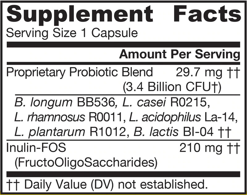 Синбиотик (пробиотик плюс пребиотик) с шест документирани щама. Формулиран с инулин-фруктоолигозахариди (FOS) за допълнителна хранителна подкрепа за полезните бактерии.