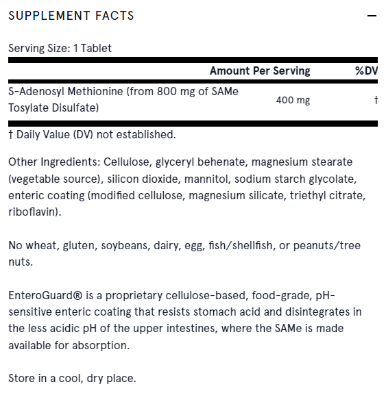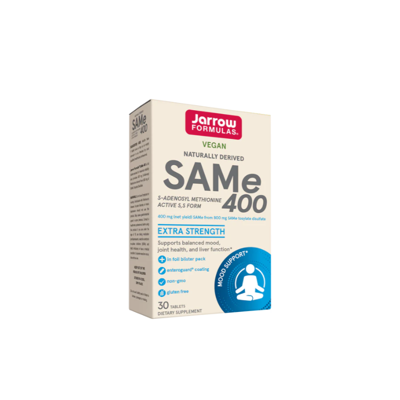 Jarrow Formulas® SAM-e 400 осигурява пълни 400mg SAM-e от 800mg SAM-e тозилат дисулфат. SAM-e 400 се произвежда при ниска температура и ниска влажност и е с ентерично покритие, за да се осигури биологично активен продукт.