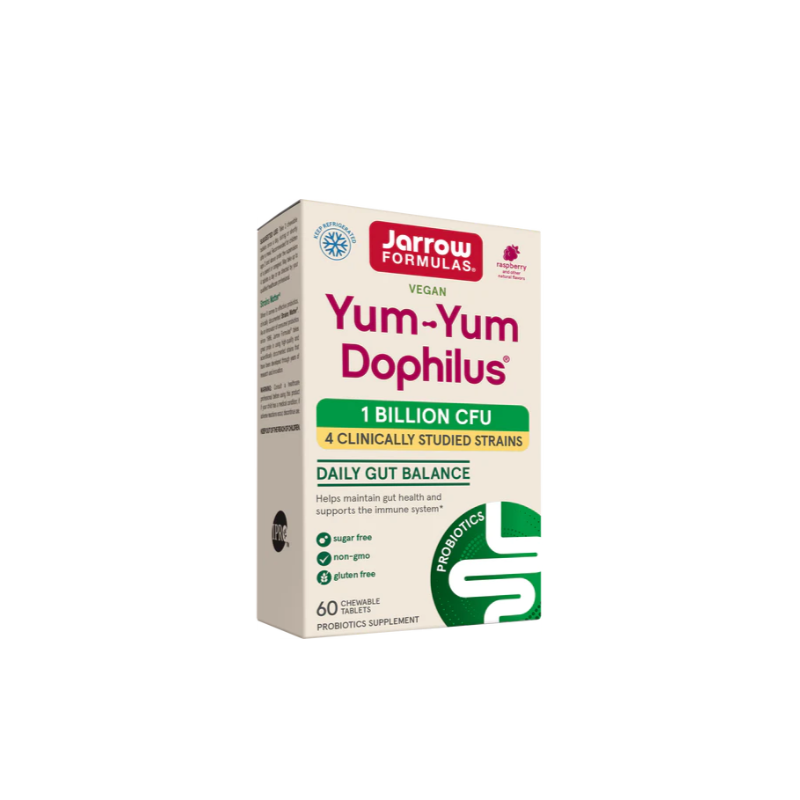 Jarrow Formulas® Yum-Yum Dophilus® – пробиотик за деца, предоставя 4 клинично документирани щама полезни бактерии във вкусна таблетка за дъвчене. Полезната чревна флора може да бъде отрицателно повлияна или намалена от диета с ниско съдържание на фибри, високо съдържание на животински протеини, употреба на лекарства, пътуване и стрес и т.н. Резултатът е дисбиоза (т.е. нарушаване на чревната микрофлора), което може да влияят негативно на стомашно-чревната функция и благосъстоянието.