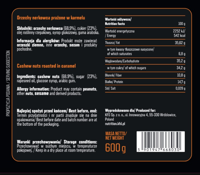 Удобната опаковка от 650 грама гарантира дълготрайна свежест и лесно съхранение. Това прави KFD Cashews in Caramel идеални за споделяне с приятели или като добавка към различни ястия и десерти. Изборът на KFD Cashews in Caramel 650g е избор за уникален вкус, високо качество и натурални съставки.