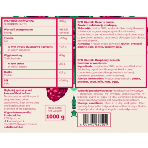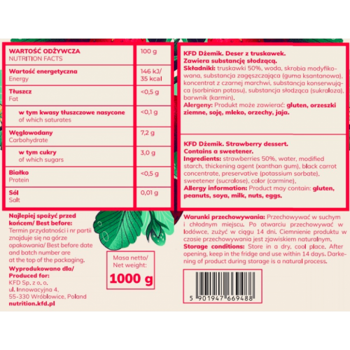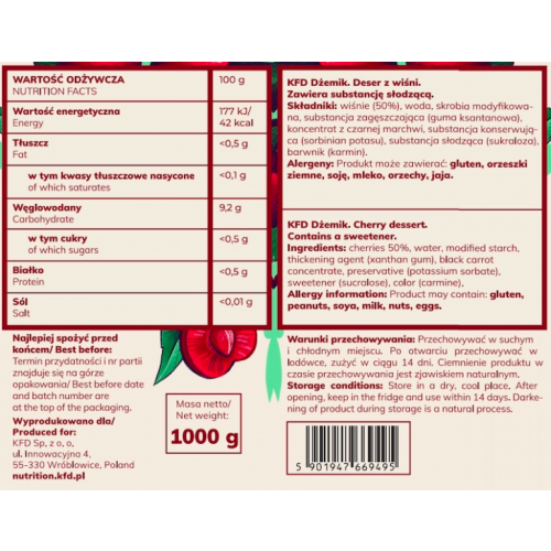 Конфитюрът на KFD съдържа само около 40-50 калории (в зависимост от вкуса) на 100гр и не по-малко от 50% истински плодове под формата на големи сочни парчета. Диетичният му състав го прави чудесен избор за хора на строга диета, които имат силно желание да разнообразят храненето си с нещо сладко. Много е подходящ за добавяне към овесени ядки, йогурт, протеинови палачинки, както и за готвене на нискокалорични десерти.