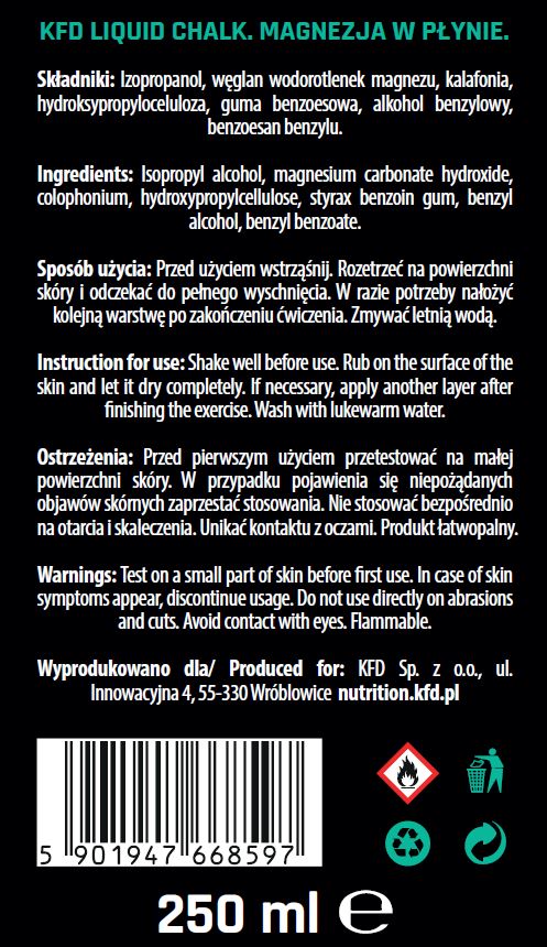 Може да го нанасяте върху ръцете или краката, общо взето където ви е необходим. KFD Liquid Chalk помага при най-различни тренировъчни упражнения – независимо дали това е катерене, вдигане на тежести, голф или гимнастика.