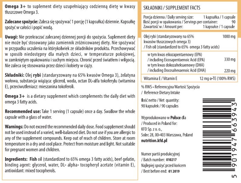 KFD Omega 3+ е източник на ненаситени мастни киселини, получени от риба. Комплексът се състои от DHA и ЕРА киселини.