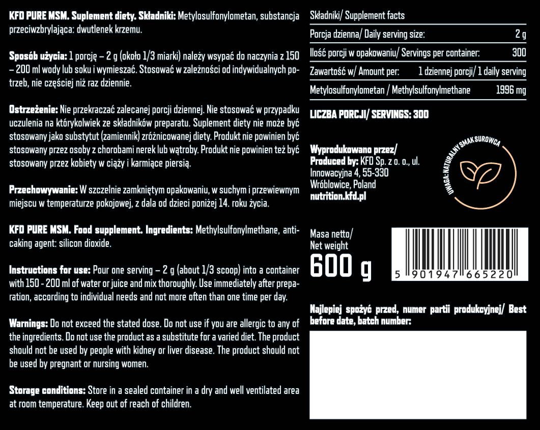 KFD Pure MSM е чист продукт без добавени подсладители и аромати, чиста суровина от най-високо качество без добавени допълнителни съставки. Той е много подходящ за смесване с други добавки, защото се разтваря много добре във вода.