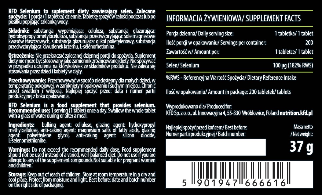 Селенът е важен микроелемент, отговорен за протичането на много важни процеси в нашето тяло. Приемът на достатъчно количество селен има голямо значение за състоянието на щитовидната жлеза и нейния имунитет. Той има доказано антидепресантно действие и се използва като противовъзпалително средство при ставни болки. KFD Selenium съдържа органична форма на минерала селен и е с много високо ниво на усвояемост, което го прави пълноценен източник на селен. Тази хранителна добавка е предназначена за хора, които са изложени на риск от недостатъчен прием на селен, поради спазване на строга диета, спортисти подложени на големи натоварвания или хора с установени ниски нива на селен в организма. Селенът също така има мощни антиоксидантни свойства, които потискат ефектите на оксидативния стрес чрез елиминиране на свободните радикали. Тъй като микроелементът е пряко отговорен за производството на тиреоидни хормони от щитовидната жлеза, често се препоръчва при наличие на автоимунни тиреоидни заболявания на щитовидната жлеза. В много от случаите ниските нива на селен са отговорни за проблеми с щитовидната жлеза. Начин на прием: 1-2 таблетки дневно или както е предписал вашият лекар.
