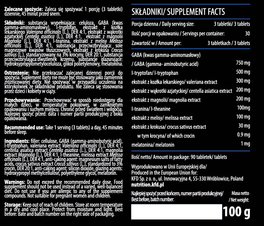 В доза от 3 таблетки, продукта съдържа 750мг. от аминокиселината ГАБА. Основната роля на ГАБА е като успокоително на невротрансмитерите в мозъка на човека, което прави заспиването по-лесно и съня по-дълбок. Тя е жизнено важна за правилното протичане на мисловната дейност. Друго основно качество на аминокиселината е свойството й да кара телата ни да произвеждат ендорфини – химикали, които накратко ни правят щастливи.