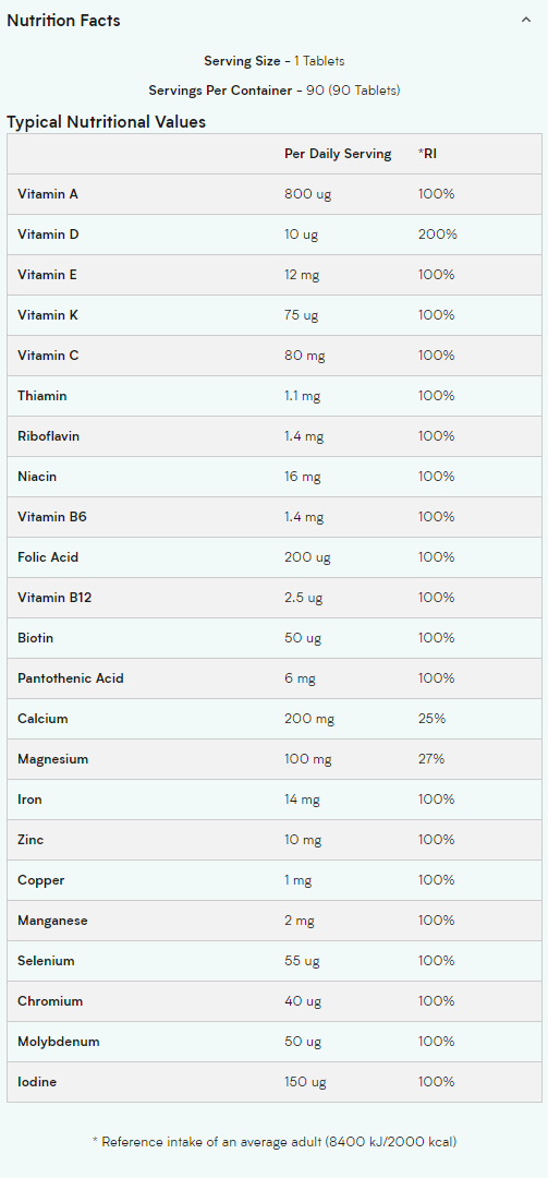 Витамините и минералите са основни хранителни вещества, необходими за поддържане на здраво тяло и ум. Те ни помагат да се поддържаме в отлично състояние, въпреки забързания живот и тренировъчните графици. Нашият AZ мултивитамин доставя уникална формула от основни витамини и минерали, които могат да се похвалят с големи ползи за здравето за всекидневно благополучие. Какви са ползите от AZ Multivitamin? Снабден с цял набор от основни витамини и минерали, включително калций, витамин С, желязо, цинк и витамини от група В, това е перфектната добавка веднъж дневно – независимо от вашите фитнес цели. Желязото и цинкът допринасят за нормалната когнитивна функция, така че винаги можете да останете една крачка напред. И нещо повече, цинкът, заедно с витамин А, поддържа здрави очи и зрение. Освен това, добавките с витамин С и витамин В12 допринасят за нормалната функция на имунната система и помагат за намаляване на умората – помагайки ви да се чувствате здрави и тонизирани, за да се подхранвате през натоварения си график. Кога да приемате AZ Multivitamin? Приемайте само една таблетка дневно, за да получите цял набор от ползи за здравето. Желязото допринася за нормалната когнитивна функция Цинкът допринася за нормалната когнитивна функция Цинкът допринася за поддържането на нормално зрение Витамин А допринася за поддържането на нормално зрение Витамин С допринася за намаляване на умората и отпадналостта Ниацинът допринася за намаляване на умората и отпадналостта Магнезият допринася за намаляване на умората и отпадналостта Витамин В12 допринася за намаляване на умората и отпадналостта Витамин В6 допринася за намаляване на умората и отпадналостта Желязото допринася за нормалната функция на имунната система Селенът допринася за нормалната функция на имунната система Витамин С допринася за нормалната функция на имунната система