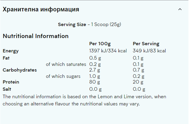 Myprotein Clear Whey Isolate е много чист протеин – съдържа само 0.1гр мазнини, 0.3гр захар и по-малко от 90 калории в доза! Хидролизираният протеин е най-бързо усвоимият протеин на пазара, тъй като преминава допълнителна преработка и протеиновите молекули се разбиват до пептиди. Освен това от състава му се премахват 90% от съдържащите се в суроватъчния концентрат – мазнини и лактоза.