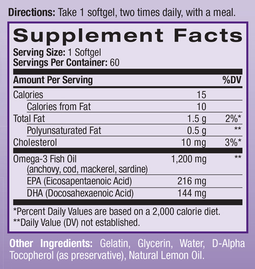 С доза от 1200 мг пречистено рибено масло в гел-капсула, Natrol Омега-3 1200 мг предоставя на тялото ви всички здравословни ползи на рибеното масло, от които, тялото ви се нуждае. Рибеното масло е с доказани ползи върху здравето на очите, сърцето и костите.