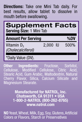 Поставени в устата, таблетките с витамин D3 на Natrol за кратко време се разтварят, което ефективно улеснява тяхното преглъщане. По този начин бива ускорен и процесът на усвояване на продукта и неговите здравословни ползи от организма.