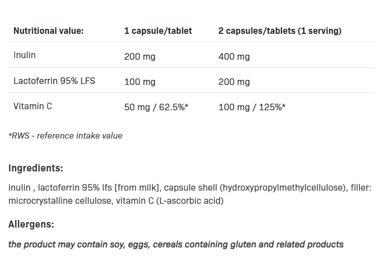 Оптимизирайте своето здраве с SFD Лактоферин: Извайте потенциала на този мощен протеин Открийте силата на лактоферина, протеина, който революционира здравето. Извлечен от природата, лактоферин предоставя богатство от ползи – от подкрепа на имунната система до регулиране на нивата на желязо, правейки го задължителен за тези, които търсят естествено повишаване на здравето си. Основни Ползи: Подпомагане на имунната система: Повишавайте естествената защита на организма си с лактоферин. Този мощен протеин действа като страж, предпазвайки ви от външни атаки и правейки ви устойчиви срещу обичайните здравословни предизвикателства. Желязо в хармония: Изживейте оптимални нива на желязо чрез способността на лактоферина да го свързва. Сбогувайте се с дисбаланса в желязото и приемете естествено, устойчиво решение за поддържане на желязния баланс в организма ви. Контрол на възпаленията: Използвайте анти-възпалителните свойства на лактоферина, за да облекчите възпаленията и да насърчите общото удобство. Приемете холистичен подход към здравето, който се занимава с възпалението в корен. Подкрепа за здравето на черния дроб: Заздравете черния си дроб с подкрепата на лактоферина за поддържане на здрава храносмилателна среда. Постигнете баланс отвътре, насърчавайки общото здраве на храносмилателната система. Естествено Повишаване на Здравето: Възползвайте се от лактоферина за естествено повишаване на здравето. Този биоактивен съединител е извлечен от природата и предлага органични ползи без нужда от синтетични добавки. Универсално Здравни Решения: Представете лактоферина като универсално решение за здраве. От подкрепа на имунната система до грижа за черния дроб, този мощен протеин предлага холистичен подход към общото благополучие. Пазарувайте с Увереност: Разгледайте нашия асортимент от продукти с лактоферин, подкрепени от гаранции за качество и удовлетворение на клиентите. Придайте приоритет на своето здраве с увереност, като инвестирате в премиум, научно обоснована добавка. Начин на употреба: Приемайте една доза от продукта (1 капсула) два пъти на ден, преди хранене, с вода.