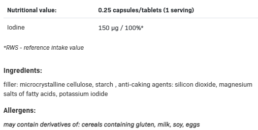 SFD POTASSIUM IODIDE е хранителна добавка под формата на таблетки, съдържаща източник на йод, който спомага за правилното производство на хормони на щитовидната жлеза, поддържа правилното функциониране на щитовидната жлеза и спомага за поддържане на правилни когнитивни функции. Йоден дефицит Първият симптом на йоден дефицит може да бъде отслабване на имунитета на организма. Йодът има антиоксидантни свойства и значителният му дефицит води до намаляване на защитата срещу атаките на свободните радикали. Нуждата от йод в човешкото тяло може да варира в зависимост от възрастта и здравословното състояние. Неговият дефицит причинява, наред с други, структурни промени в щитовидната жлеза. SFD POTASSIUM IODIDE е модерна хранителна добавка с чиста и проста формула, ще ви стигне много дълго време, защото дневната доза е 1/4 таблетка. Начин на употреба: ¼ таблетка дневно с вода.
