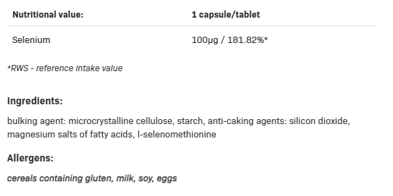 SFD SELEN 100 е хранителна добавка, съдържаща селен под формата на L-селенометионин. Селенът спомага за поддържането на здрави коса, кожа и нокти, допълнително допринася за правилното функциониране на щитовидната жлеза и спомага за защитата на клетките от оксидативен стрес. SFD SELEN 100 създаден под формата на таблетки, осигуряващи високо усвоима, органична форма на селен – микроелемент, който играе важна роля в много биологични процеси в тялото. Свойства на селен: