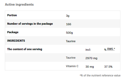 Тауринът е продукт, който действа като метаболитен предавател, който например позволява да се подобри транспорта на креатина до мускулните клетки. В същото време тауринът участва в синтеза на телесни протеини. Той помага да се регулират нивата на кръвната захар, има антикатаболен ефект (намалява разграждането на протеините), повишава нивата на азот в организма и спомага за понижаване на холестерола. Той също така блокира чувството на умора, така че можете да тренирате по-дълго. Начин на употреба: Разтворете 3g в 300ml вода или сок и приемайте 1 доза дневено между храненията и след тренировка с креатин.