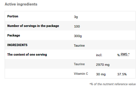 Тауринът е продукт, който действа като метаболитен предавател, който например позволява да се подобри транспорта на креатина до мускулните клетки. В същото време тауринът участва в синтеза на телесни протеини. Той помага да се регулират нивата на кръвната захар, има антикатаболен ефект (намалява разграждането на протеините), повишава нивата на азот в организма и спомага за понижаване на холестерола. Той също така блокира чувството на умора, така че можете да тренирате по-дълго. Начин на употреба: Разтворете 3g в 300ml вода или сок и приемайте 1 доза дневено между храненията и след тренировка с креатин.